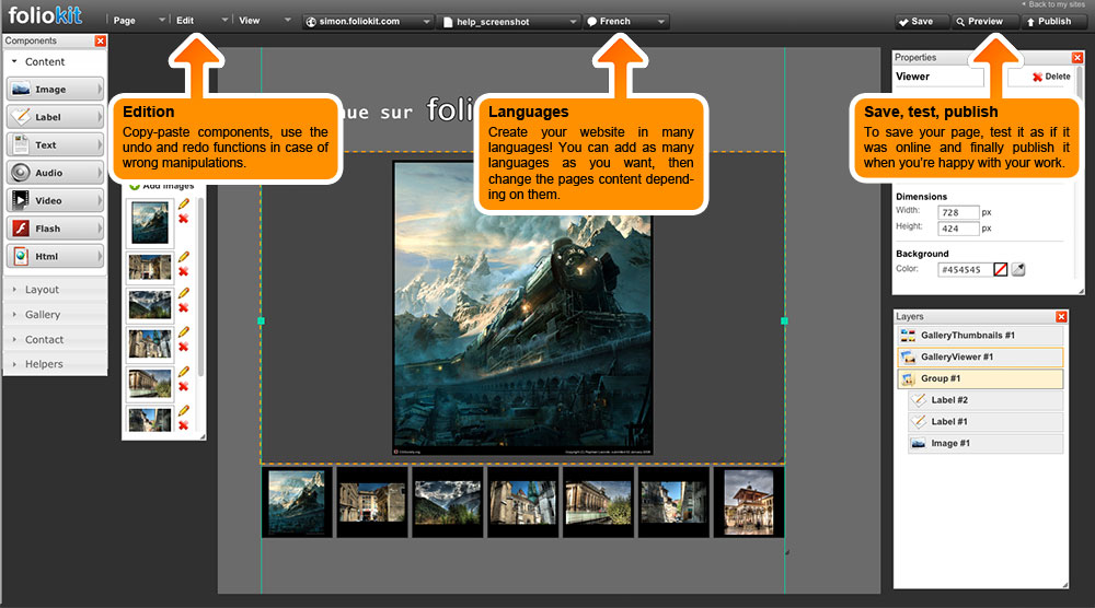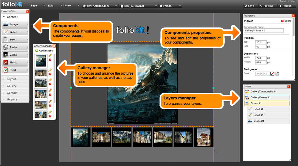 The components of the Foliokit editor allows you to create your web pages with great simplicity while maintaining maximum flexibility.