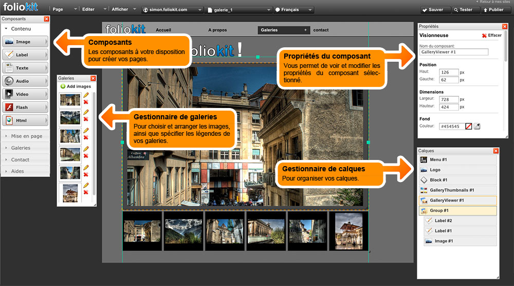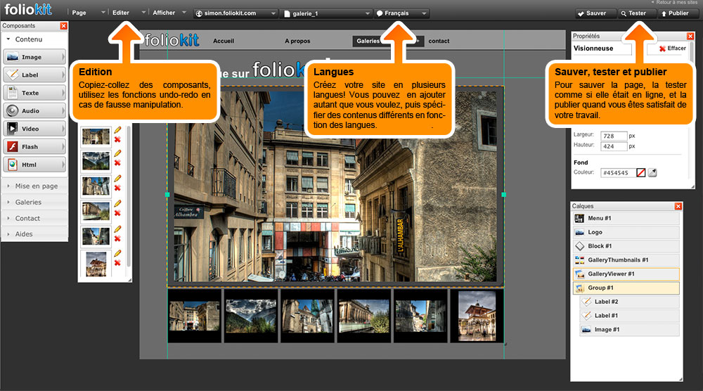 L'éditeur Foliokit vous fournit les outils nécessaires à la création de votre site web, en vous laissant un maximum de liberté tout en restant simple à utiliser.
